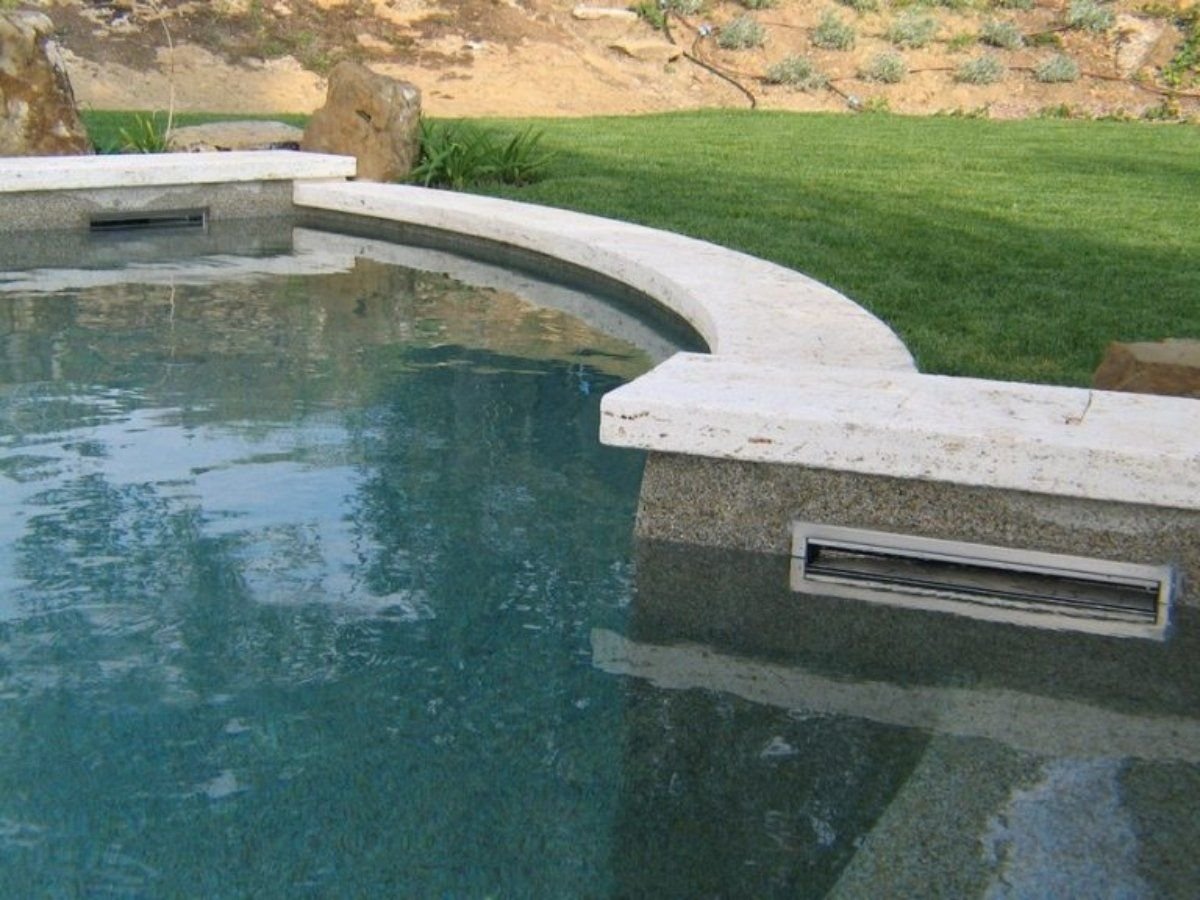 Η πέτρα που τοποθετήθηκε στο εσωτερικό της πισίνας για το πλακόστρωτο και τα σκαλοπάτια επεξεργάστηκε με ειδικό φινίρισμα πατίνας και στη συνέχεια στοκάρισε, καθιστώντας την ευχάριστη στην αφή, αντιολισθητική και ταυτόχρονα εύκολη στο καθάρισμα και λειτουργική από πλευράς χρήσης.