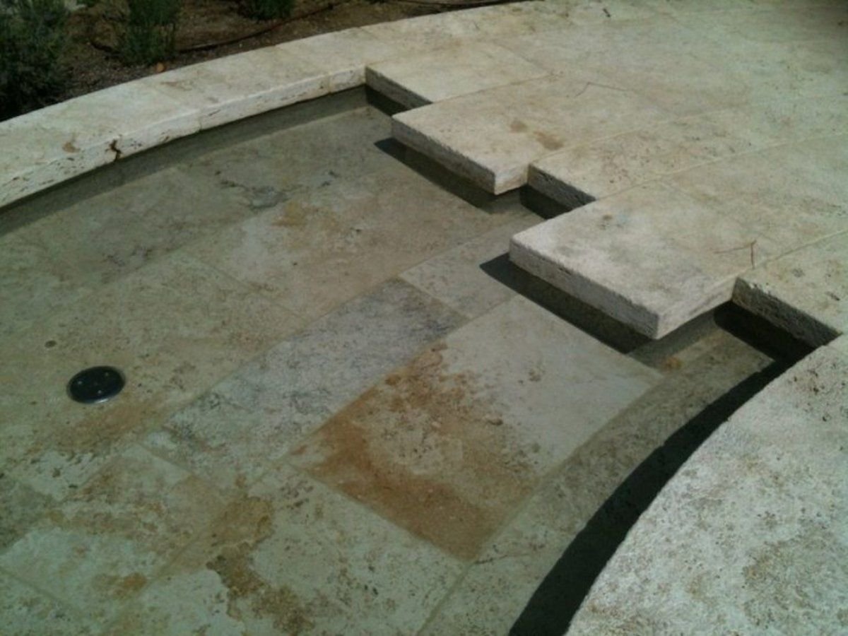 «Το εξωτερικό μέρος που περιελάμβανε το κάθισμα και το πλακόστρωτο στην είσοδο της πισίνας υποβλήθηκε σε διαδικασία «μαρτελατούρα» , ή σφυρηλάτηση, και στη συνέχεια επικαλύφθηκε χωρίς την εφαρμογή στόκου στους πόρους του τραβερτίνης.
