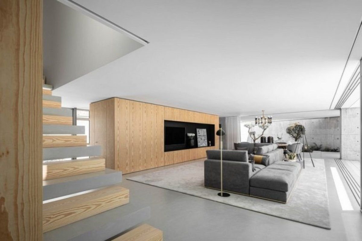 The private spaces are highlighted by internal voids, resulting from the creation of a clear, blind volume, based on the retaining wall, which is enclosed – where, exceptionally, one of the adjacent walls is geometrically perforated, thus creating a point of entry. at high altitude – allowing control of light and visual relationships with the environment