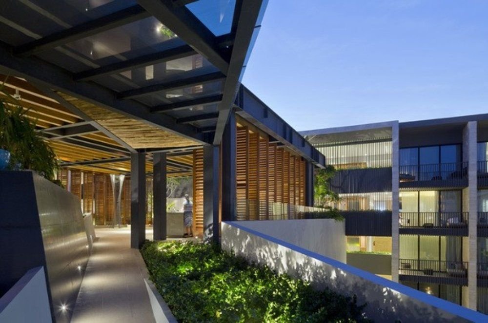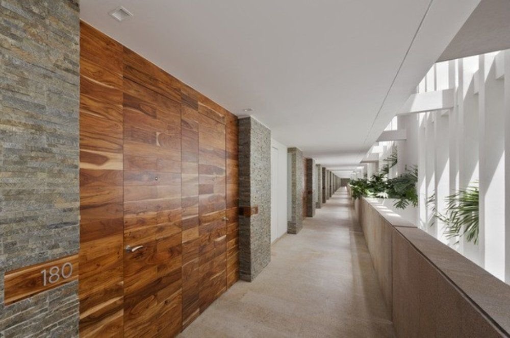 Above this garden and right in the center of the second block is an open covered walkway, with amenities, gazebos and an excellent view of the sea, which can be seen from the first block. The space below this walkway is used for meeting rooms and the spa.