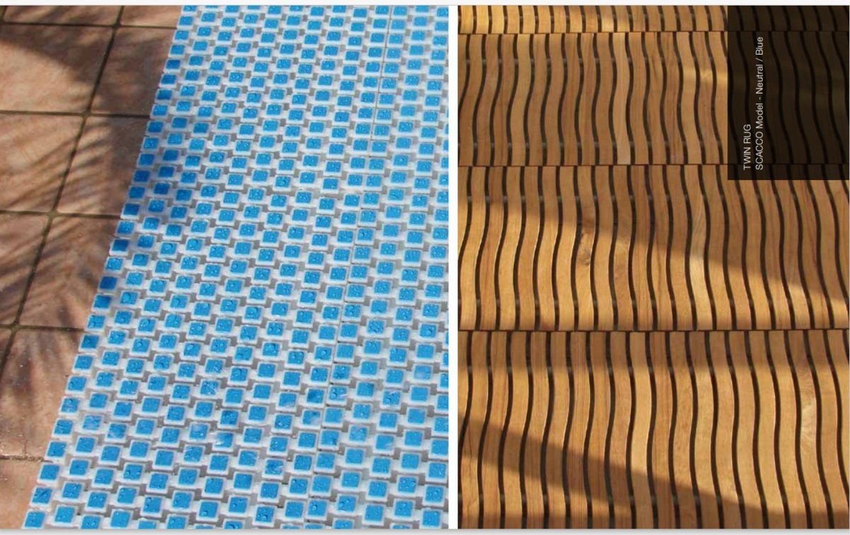 Διατίθεται στις τρεις εκδόσεις: Onda, Scacco, Esse σχεδιασμός και είναι προσαρμόσιμο για χρώμα και λογότυπο. Το δάπεδο, κατασκευασμένο από την TWIN TEAK bi-component. Το τρίψιμο, (Ξύλο + Πολυπροπυλένιο) χαρίζει κομψότητα και ευχάριστη αίσθηση στην αφή ως μόνο φυσικό και ένα ευγενές προϊόν μπορεί να κάνει. Διατίθεται σε σχέδιο Onda. Οι διάφορες μονάδες ενώνονται με μια πλαστική αγκύρωση στο σύστημα και ένα ελαστικό παρέμβυσμα που εξασφαλίζει σταθερότητα στο προϊόν και σταθερότητα στο πάτωμα